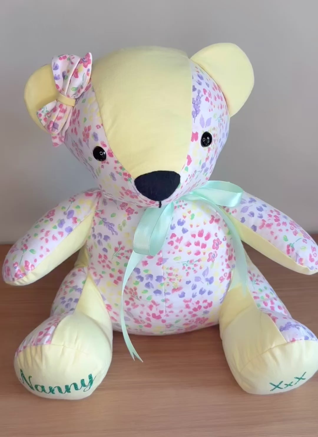 Lovingly handcrafted from your cherished clothing items, our memory bears are a beautiful way to preserve treasured moments—whether celebrating the early days of your baby’s life or honouring the memory of someone special. Every bear is made with care and attention to detail, offering a lasting keepsake that brings comfort for years to come.